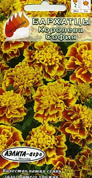 Tagetes patula nana Queen Sophia Невозможно представить себе цветник без этих прелестных цветов. Даже самый неискушенный цветовод сможет вырастить их без труда. В полную силу демонстрирует роскошь цветения на солнечных местах. А цветение бархатцев настоящая услада для глаз, когда крупные, диаметром 7 см, плоскоокруглые, анемоноцветные соцветия, ярких солнечных окрасок, распускаются на прелестном, компактном, растении высотой 30 см. Универсальны в своем использовании - прекрасно смотрятся на клумбах, рабатках, группами на газоне.