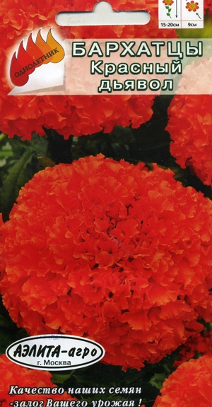 Tagetes patula nana Red Brocade Однолетнее компактное растение, высотой 15-20 см. Красивые раскидистые кусики обильно покрыты махровыми, кроваво-алой насыщенной окраски, черезвычайно изящными соцветиями (до 9 см в диаметре). Цветение раннее и обильное и длительное - с июня и до самых заморозков. Один из лучших сортов для создания различных клумб, рабаток, бордюров, оформления балконов.